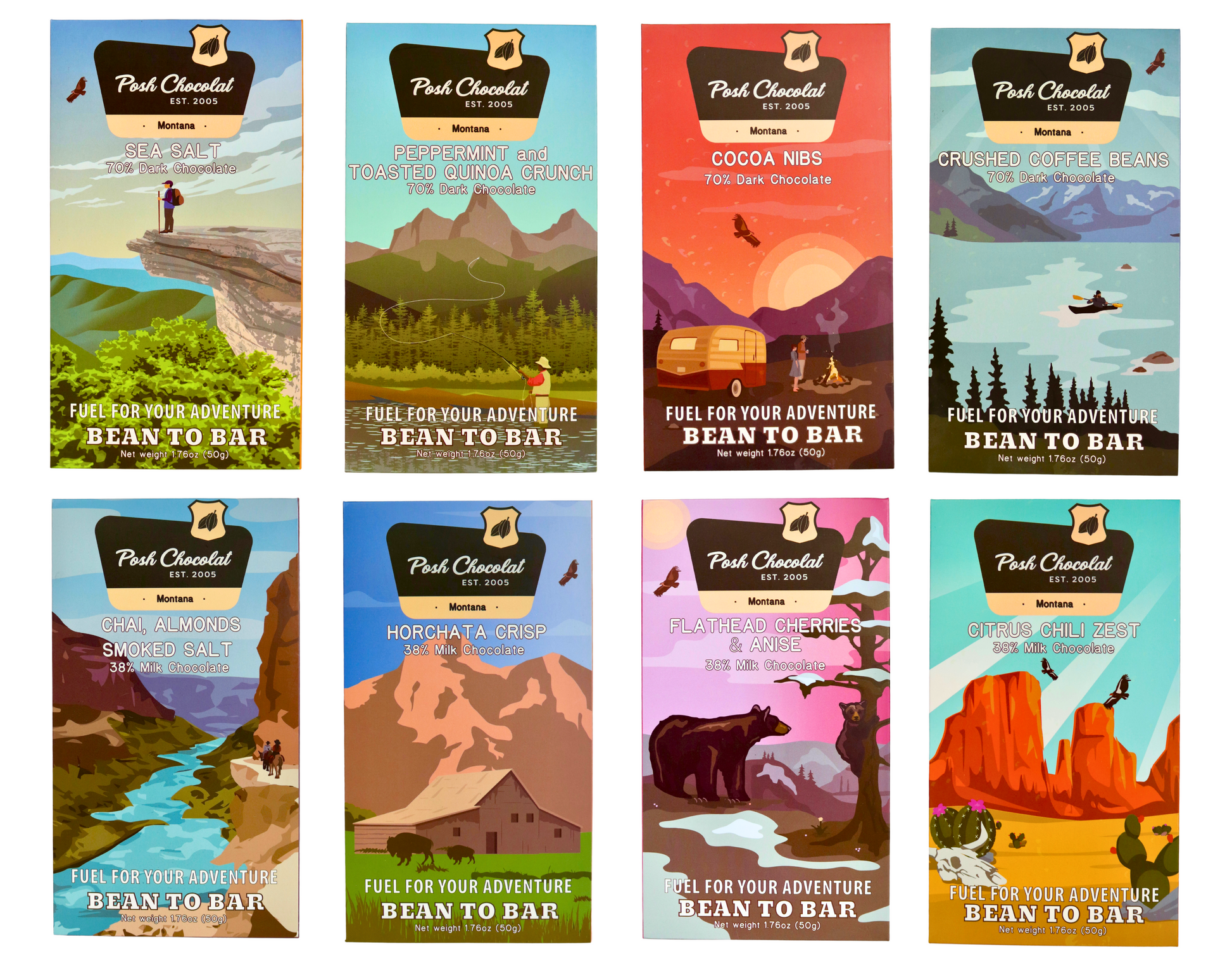 Our collaboration with the U.S. National Parks is finally here! Each 8 pack collection of chocolate bars commemorates the National Parks. Every bar features our own, unique blends of the highest quality chocolate, handmade in small batches in Missoula, MT.