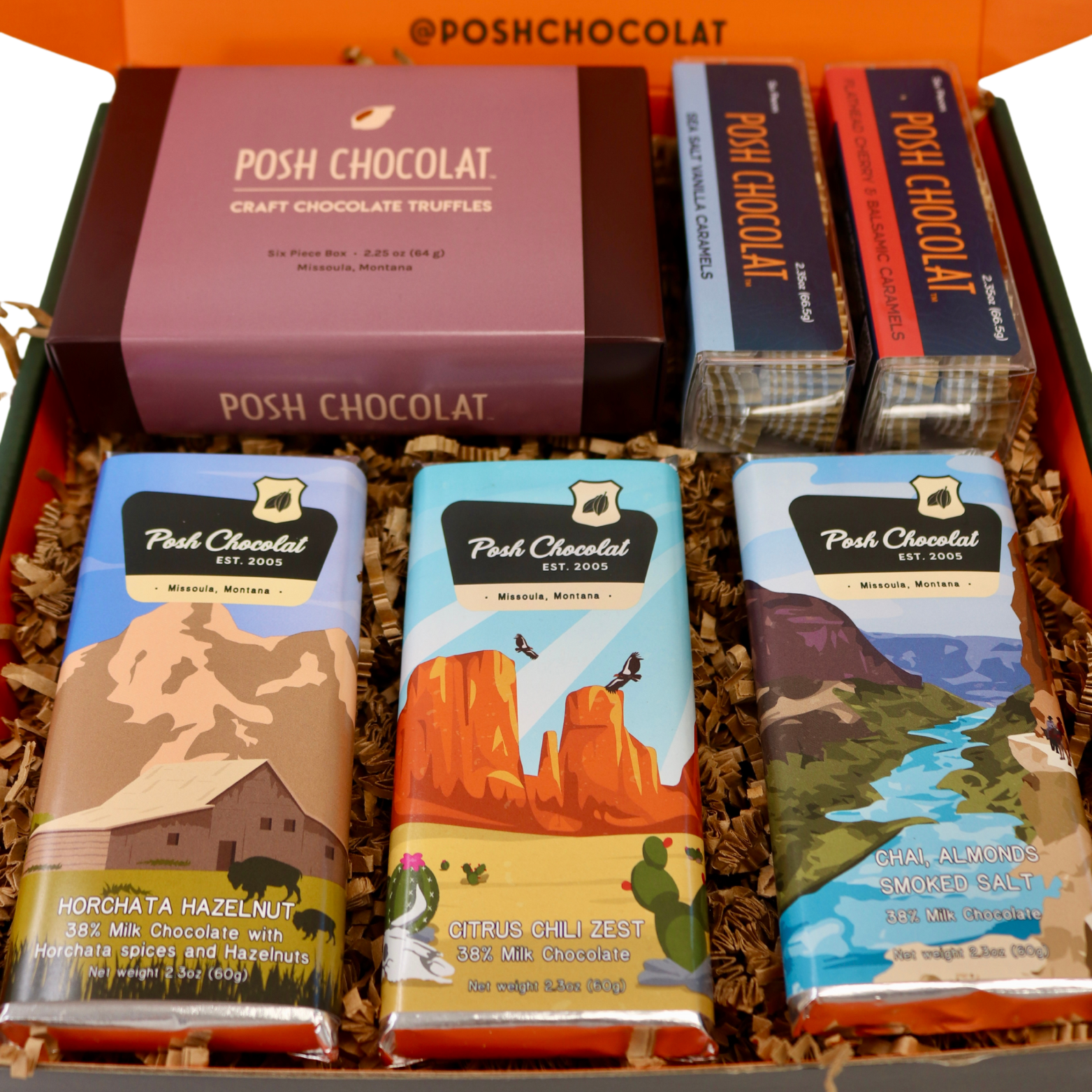 Introducing the BIG SKY chocolate package, a delightful adventure for your taste buds! Inside this beautifully designed, adventure-inspired mailer box, you’ll find a tantalizing selection of treats: