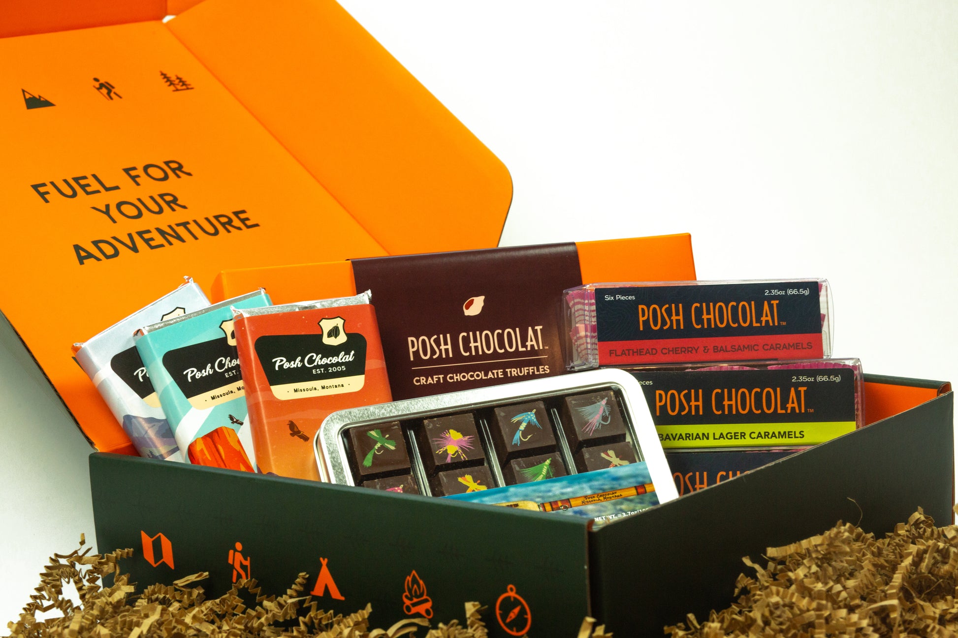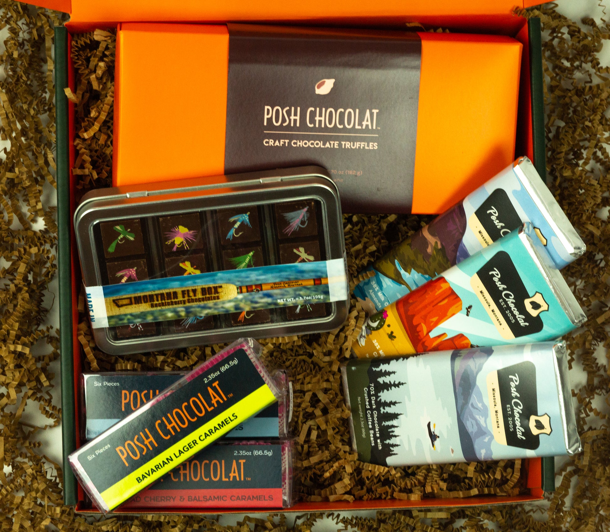 The package also features the iconic Montana fly box, uniquely filled with huckleberry bonbons, giving a nod to Montana's famous wild berries. To complete the experience, it comes with 3 artisan caramel packages, known for their melt-in-your-mouth decadence. All these delicious items are beautifully packed in a stunning adventure-inspired mailer box, making it an ideal gift for nature lovers and chocolate enthusiasts alike.