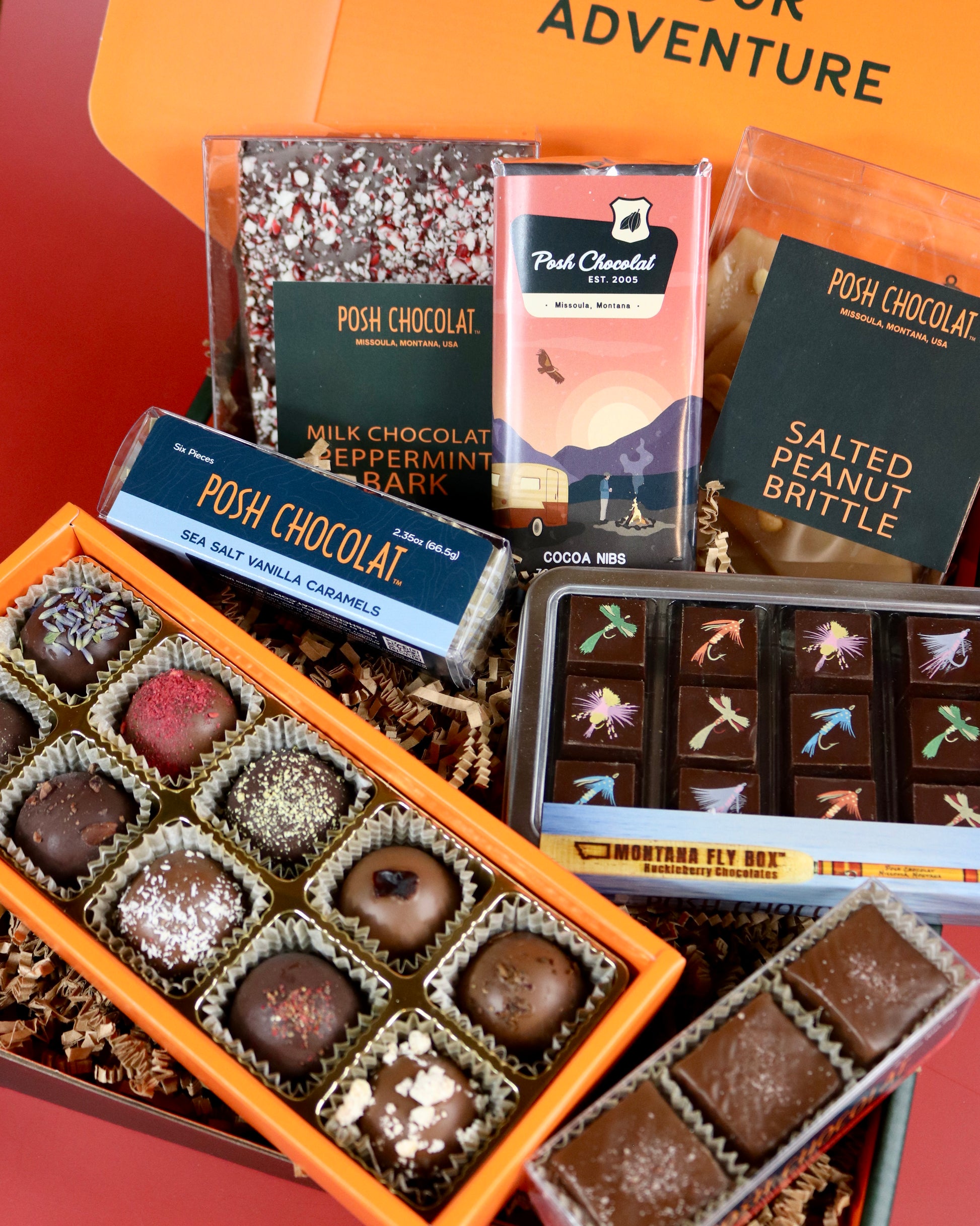 - The iconic Montana fly box, brimming with 12 huckleberry chocolates, a signature touch of the season.